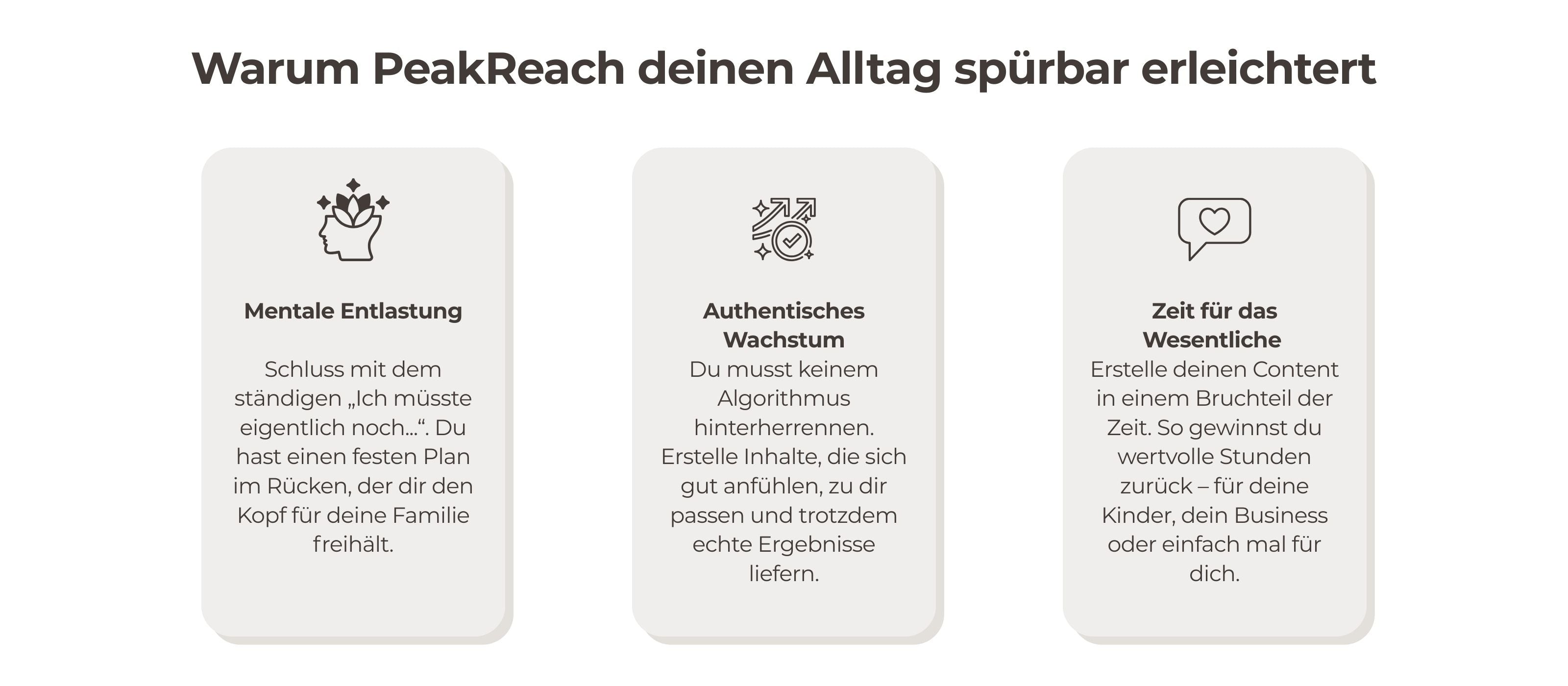 PeakReach wurde speziell für Mamas entwickelt, die zwischen Familie und Business sichtbar werden möchten. Du bekommst genau die Inhalte, die dir Zeit sparen, Druck rausnehmen und Kunden bringen.