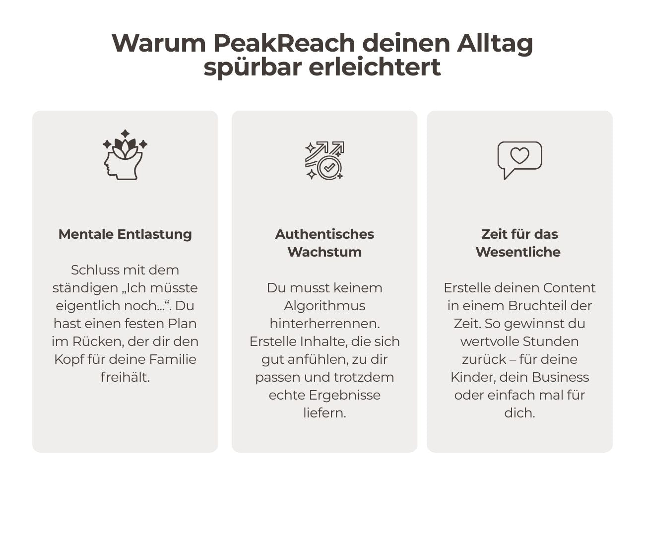 Ich poste oft abends, manchmal gar nicht. Trotzdem bekomme ich durch PeakReach endlich Anfragen. Die Ideen sind einfach, klar und alltagstauglich. Keine Theorie, sondern echte Hilfe für Mamas, die nicht stundenlang am Handy sitzen können.