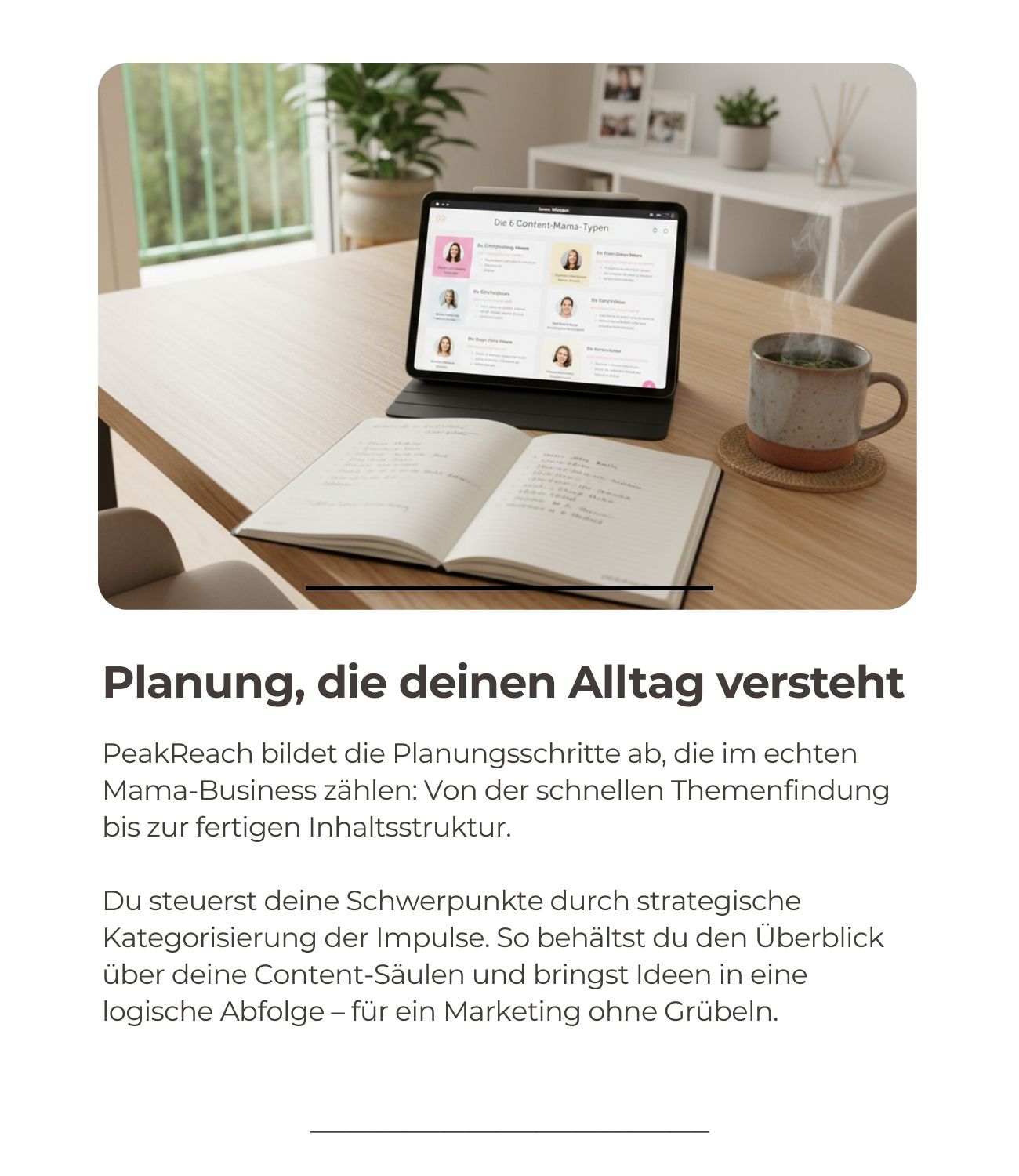 Ich habe zwei kleine Kinder und kaum ruhige Minuten. PeakReach ist das erste Tool, das wirklich versteht, wie unplanbar mein Alltag ist. Ich brauche nur ein paar Minuten und habe sofort eine Idee, die zu meinem Business passt. So viel Stress weniger.